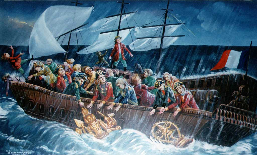 சிலைகளைக் கப்பலில் ஏற்றிச் செல்லும் போது சண்முகரின் சக்தியால், பெரும் மழையும் புயலும் வந்து, கப்பலே கடலில் கவிழ்ந்து விடும் நிலை வர, டச்சுக்காரர்கள் சண்முகரின் சக்தியை அறிந்து, சிலைகளைக் கப்பலில் வைத்திருந்தால் எல்லோருடைய உயிருக்கும் ஆபத்து வந்துவிடும் என்று எண்ணி சண்முகரையும் நடராஜரையும் கடலுக்குள் போட்டு விடுகின்றனர்.